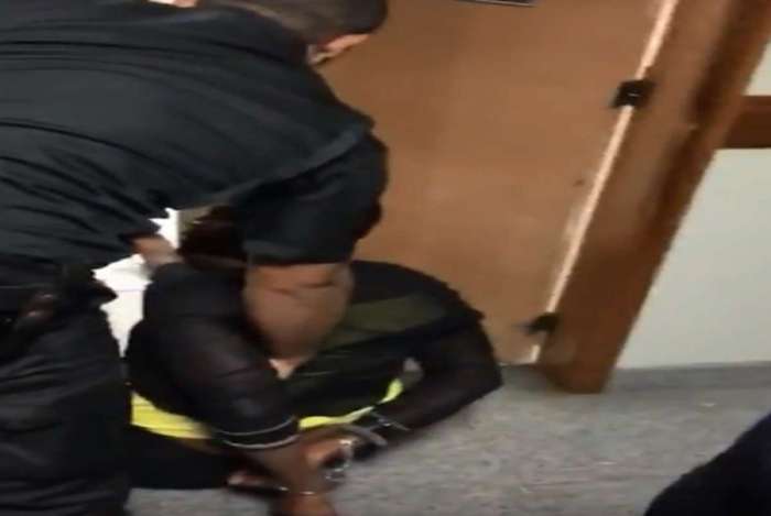 Por fim, a advogada aparece algemada, sentada no chão da sala de audiências, próxima à porta, cercada por policiais militares, afirmando diversas vezes que só quer exercer “o direito de trabalhar”.