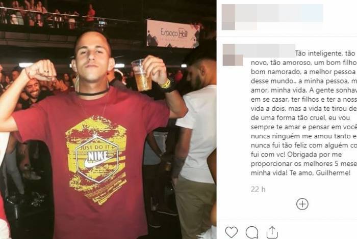 Nas redes sociais, ela publicou uma foto em que falava sobre os sonhos do casal de casar e de ter filhos. “Tão inteligente, tão novo, tão amoroso, um bom filho, um bom namorado, a melhor pessoa desse mundo.. a minha pessoa, meu amor, minha vida. A gente sonhava em se casar, ter filhos e ter a nossa vida a dois, mas a vida te tirou de mim de uma forma tão cruel, eu vou sempre te amar e pensar em você, nunca ninguém me amou tanto e eu nunca fui tão feliz com alguém como fui com vc! Obrigada por me proporcionar os melhores 5 meses da minha vida! Te amo, Guilherme”, escreveu.