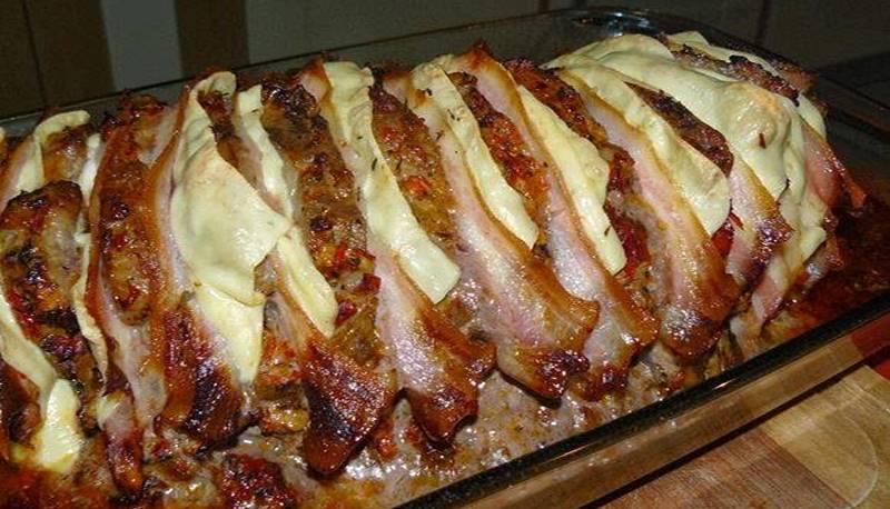 Colocar uma fatia de queijo e uma de bacon em cada sitio de corte.