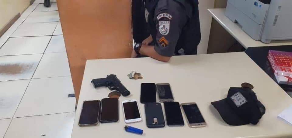 Com os bandidos estavam 01 Simulacro de Pistola e 08 Aparelhos Celulares todos produto de roubo.