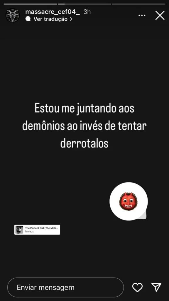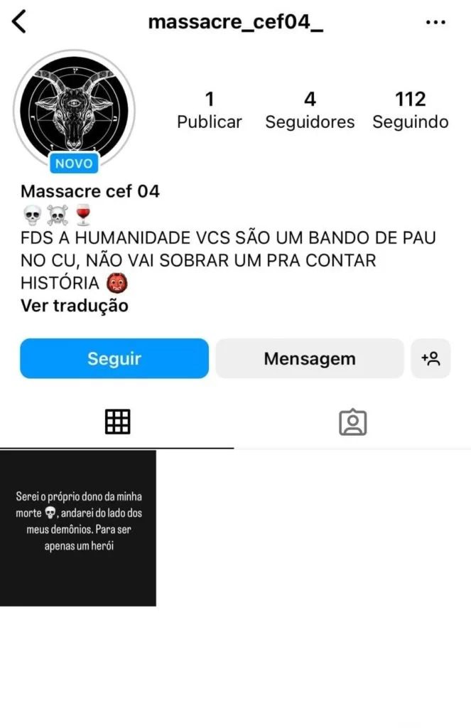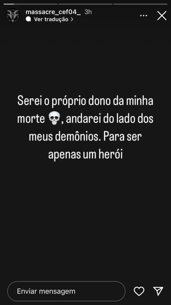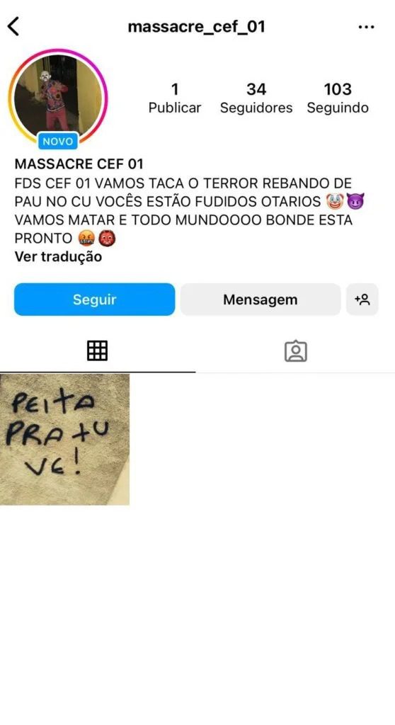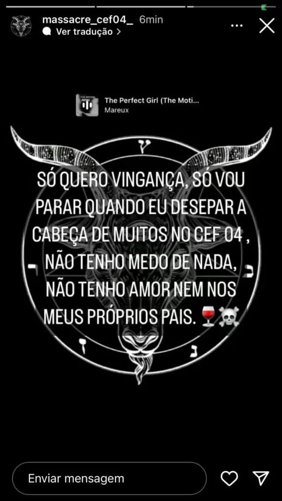 Na internet, o investigado dizia que deceparia “as cabeças de muitos” e que “não tem medo”. Ele também exibiu fotos de armas. O perfil com as mensagens foi banido permanentemente do Instagram.