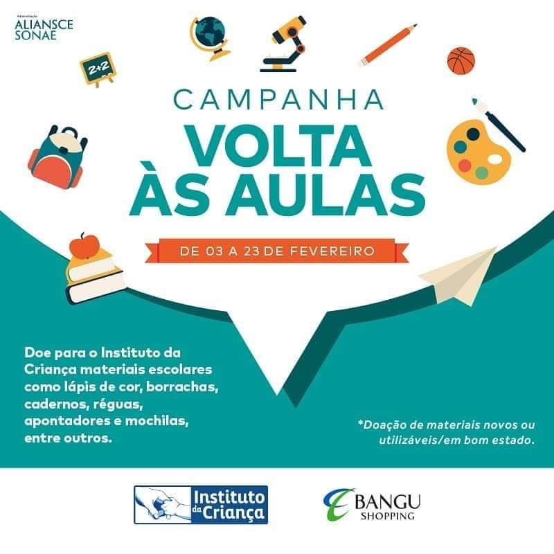 Entre os dias 03 e 23 de fevereiro, o Bangu Shopping promove a campanha “Volta às Aulas”, em parceria com o Instituto da Criança. Você poderá fazer doação de material escolar novo ou em bom estado e transformar a vida de milhares de crianças. ✏