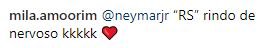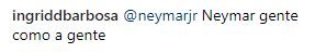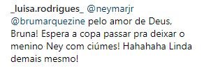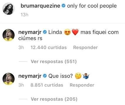 “Linda, mas fiquei com ciúmes (rs)”, ele disparou logo depois. A atriz apenas riu e disse “Te amo”, e os seguidores adoraram a interação. “RS – rindo de nervoso”, pontuou uma. “Neymar é gente como a gente”, disse outra.