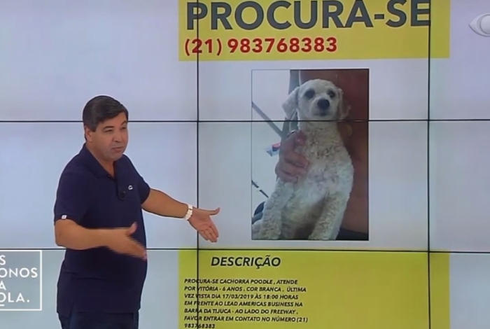 O apresentador do programa Donos da Bola da Band Rio, Edilson Silva, teve sua cachorrinha de estimação perdida. A cadela da raça poodle atende pelo nome de Vitória e está desaparecida desde o final de março deixando seu dono desolado.