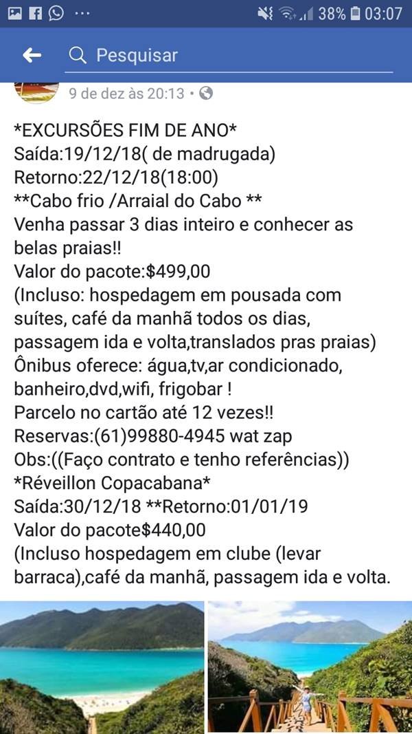 O anúncio da empresa Isatur foi publicado no Facebook. Na promoção de viagem, a empresária convida: “Venha passar 3 dias inteiro [sic] e conhecer as belas praias. Valor do pacote: R$ 499 (incluso: hospedagem em pousada com suítes, café da manhã todos os dias, passagem ida e volta e traslados pras praias”. Mais adiante, a agência reforça que faz contrato e tem “referências”.