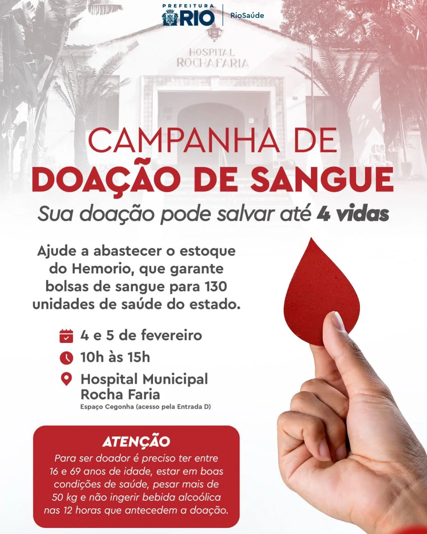 O Hemorio, responsável por fornecer bolsas de sangue para 130 unidades de saúde em todo o estado do Rio de Janeiro, está promovendo mais uma campanha essencial de doação de sangue. Nos dias 4 e 5 de fevereiro, das 10h às 15h, voluntários poderão comparecer ao Hospital Municipal Rocha Faria para fazer sua doação e contribuir diretamente para salvar vidas.