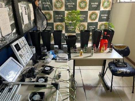 No imóvel, os agentes apreenderam uma estufa artesanal para o cultivo de vários tipos da droga. Os policiais encontraram sete pés de maconha, cada um em um vaso com terra; três potes de vidro com maconha de tipos diferentes e uma balança de precisão. No local também foram encontrados vários equipamentos utilizados para a produção do material entorpecente.