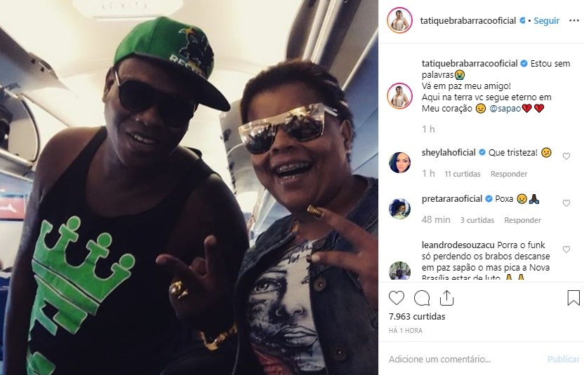 MC Guimê, marido de Lexa, postou uma foto em preto e branco com Sapão e Catra. Tati Quebra Barraco compartilhou uma foto com o falecido amigo, disse estar sem palavras e acrescentou: “Aqui na Terra você segue eterno”.