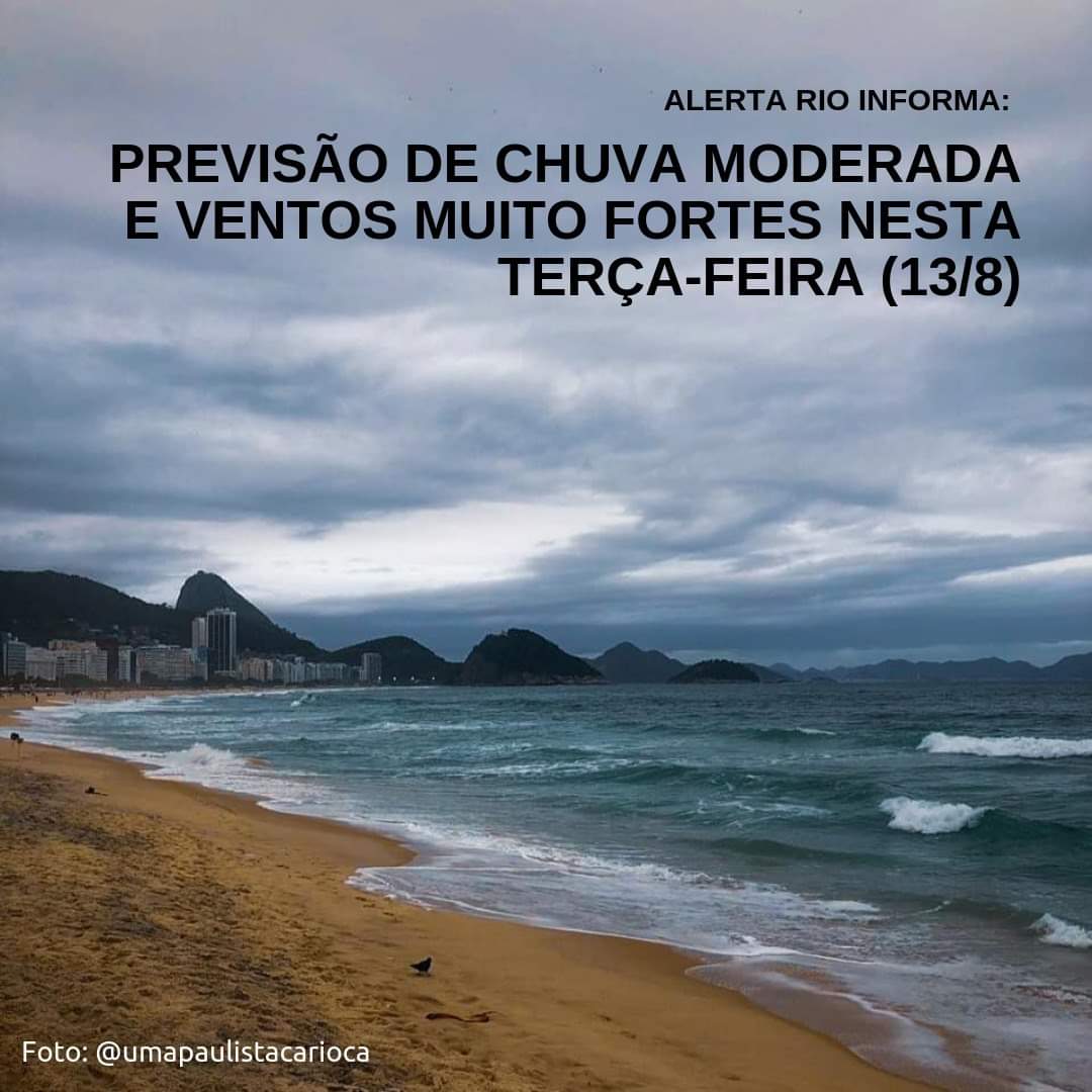➡ TERÇA-FEIRA (13/8): a chegada de uma frente fria muda o tempo no Município do Rio. A partir da manhã, há previsão de ventos moderados a fortes, com rajadas muito fortes (acima de 76 km/h), principalmente nos períodos da tarde e da noite. A partir da tarde, há previsão de aumento da nebulosidade e pancadas de chuva moderada em pontos isolados.