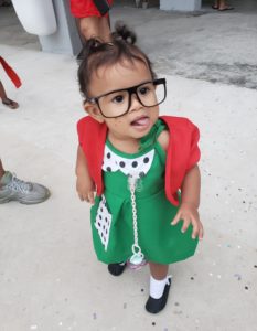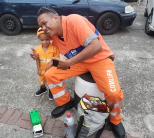 ( outro pequeno folião, fantasiado com o uniforme da Comlurb)