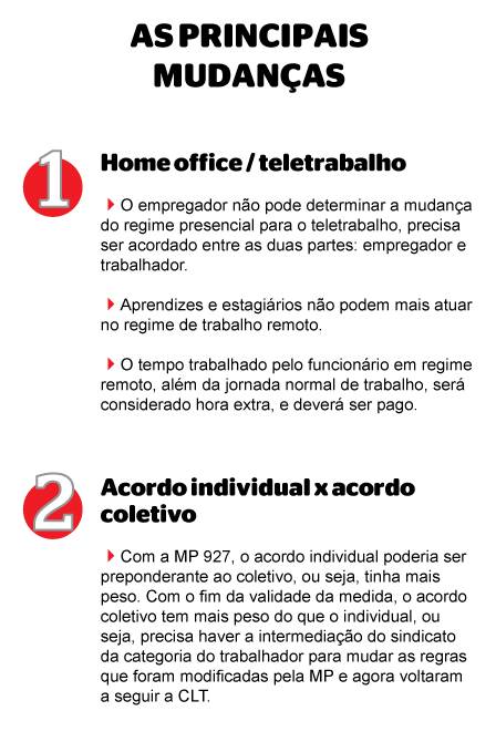 A Medida Provisória (MP) 927/2020 perdeu o prazo para a votação no último domingo e caducou. O texto, publicado em março, flexibilizava regras trabalhistas. Uma das principais mudanças, após o fim da validade da MP, é que o empregador não pode determinar unilateralmente a mudança do regime presencial para o teletrabalho. A mudança precisa ser acordada entre as duas partes: empregador e trabalhador.