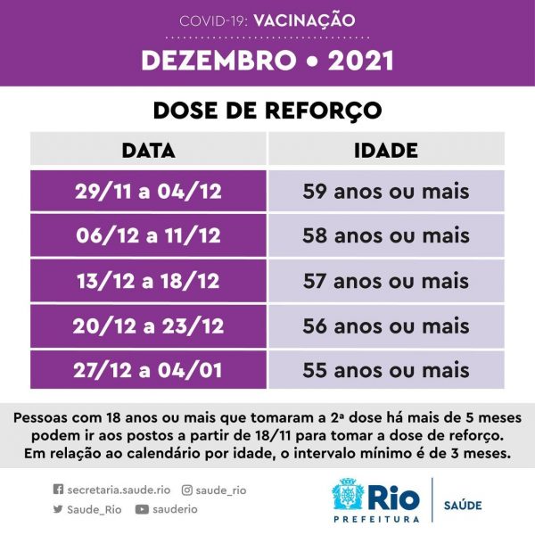 Nesta segunda-feira (6/12), a vacinação contra Covid-19 é destinada à dose de reforço para pessoas com 58 anos ou mais que tomaram a segunda dose há três meses ou mais e pessoas com 18 anos ou mais que tomaram a segunda dose há cinco meses ou mais.
