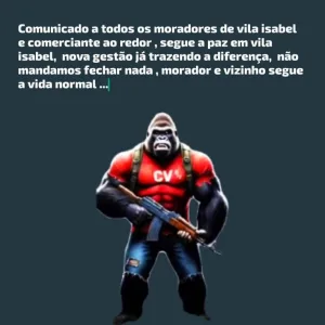 “Comunicado a todos os moradores de Vila Isabel e comerciantes ao redor: segue a paz em Vila Isabel. Nova gestão já trazendo a diferença. Não mandamos fechar nada. Morador e vizinho segue a vida normal…”
