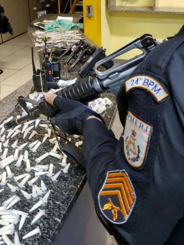 Com o bando, que não teve a identificação revelada, foram encontrados duas pistolas (uma calibre .40 e outra 22), dois revólveres 38, três radiotransmissores e drogas que vão ser contabilizadas. O material e os presos foram levados para a delegacia do município (50ª DP) e depois à Central de Flagrantes, na Cidade da Polícia, no Jacaré, na Zona Norte da capital.