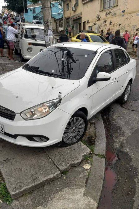 Um carro branco, envolvido na situação, está no local com várias marcas de perfurações. Ainda não se sabe se os dois mortos têm envolvimento com crimes.