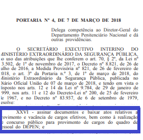 O concurso do DEPEN pode sair em breve, já que a intenção do Departamento é preencher o quantitativo de vagas o mais breve possível. Foi publicado no Diário Oficial da União uma portaria que autoriza o Diretor-Geral a assinar documentos e baixar atos relativos a provimento e vacância de cargos efetivos, bem como à realização de concurso público para provimento de cargos do quadro de pessoal do DEPEN (veja abaixo).