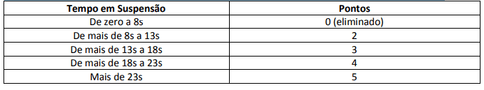 A candidata deverá permanecer no mínimo 8 segundos em suspensão para obter a pontuação mínima do teste. A não permanência em suspensão por no mínimo 8 segundos eliminará a candidata. Será concedida uma segunda tentativa à candidata que não obtiver o desempenho mínimo na primeira após cinco minutos.
