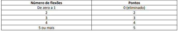 O candidato deverá realizar no mínimo duas flexões completas para obter a pontuação mínima do teste. A não execução de pelo menos duas flexões válidas eliminará o candidato. Será concedida uma segunda tentativa ao candidato que não obtiver o desempenho mínimo na primeira após cinco minutos.