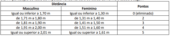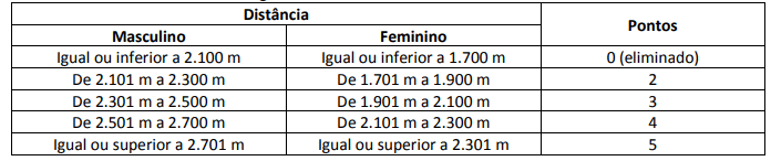 Além disso, o teste de aptidão traz Teste de Impulsão Horizontal (somente para os cargos/áreas de Agente Penitenciário Federal):