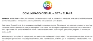 A emissora fez um pronunciamento oficial, confirmando os rumores que circulavam com fervor nas redes sociais nas últimas semanas: “Ambas as partes expressam de forma legítima sua gratidão mútua e desejam o melhor para o futuro”. Este comunicado sinaliza uma separação amigável, marcando o fim de uma era de sucessos e memoráveis momentos televisivos que Eliana proporcionou ao público brasileiro.