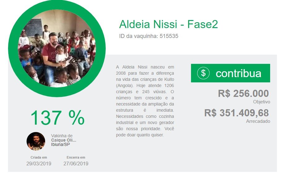 A “vaquinha”, criada por Caique Oliveira, começou a funcionar em 29 de março e terminará em 27 de junho. Contudo, em apenas cinco dias, R$ 351 mil já estão acumulados para uma ação humanitária. O valor será investido na Aldeia Nisso, em Kuito, na Angola (África).