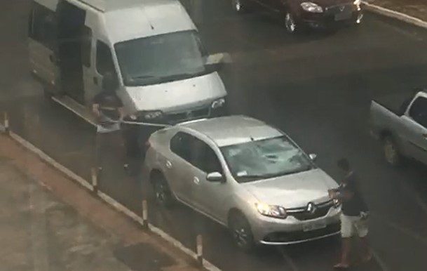 Nas imagens, é possível ver o momento em que o condutor sai da van com uma barra de ferro e bate no carro danificando a lataria e os vidros.