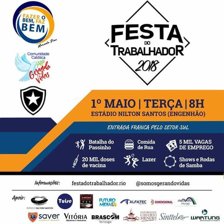 No dia 1° de maio, o Estádio Nilton Santos (Engenhão) receberá a Festa do Trabalhador 2018. No evento, profissionais de RH de mais de 30 empresas vão oferecer cerca de 5.000 oportunidades.
