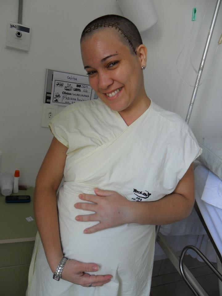 Dei entrada naquele hospital, com sinais vitais zero, depois de oito, eu disse (oito) convulsões. Fui pra sala de reanimação, por que estava morta, sem responder sinal algum. E depois de ficar entubada por horas, passei por uma bateria de exames, onde foi detectado um meningioma. Um tumor na minha cabeça, localizado em minha testa. E também uma gravidez de dez semanas… Duas notícias assim, no ato. Uma preocupante e outra já planejada e esperada por nós.