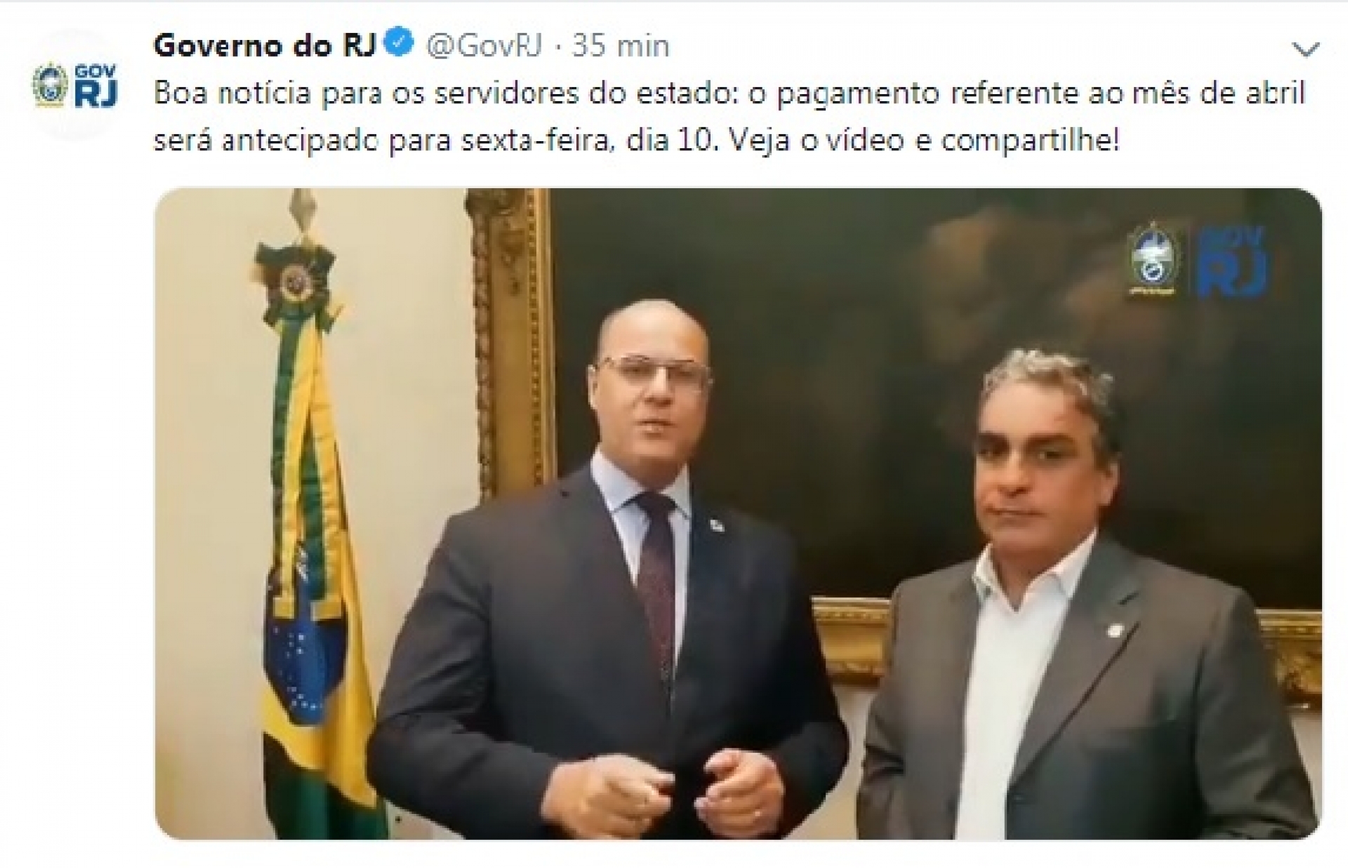 O governador Wilson Witzel fez o anúncio na rede social ao lado do presidente da Alerj, André Ceciliano (PT). No vídeo, Witzel disse que a notícia era uma “homenagem às mamães de todos os servidores do Rio”.