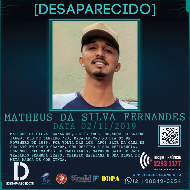 Matheus da Silva Fernandes, de 23 anos, morador do bairro Bangu, Rio de Janeiro /RJ, desapareceu no dia 02 de novembro de 2019, por volta das 20h, após sair da casa de sua avó em Campo Grande, com destino a sua residência.