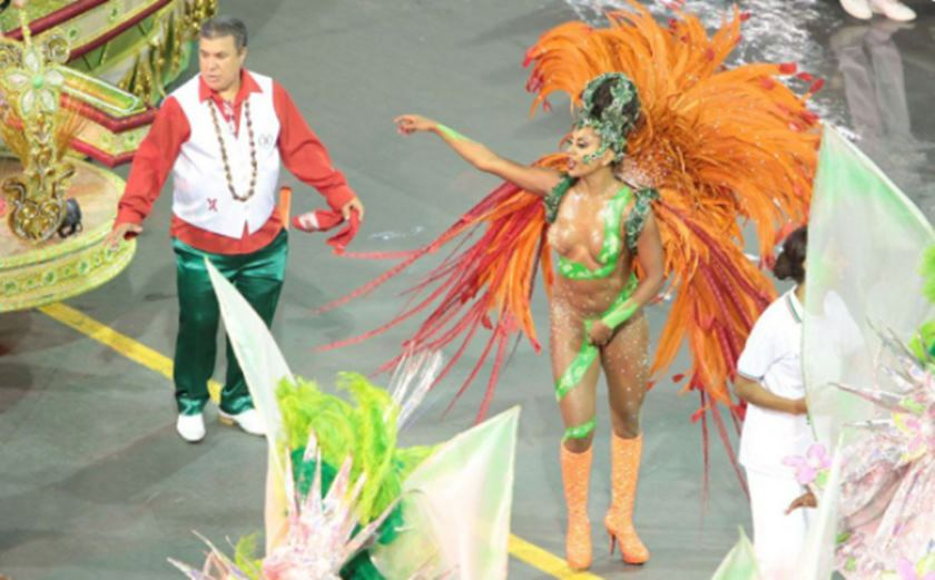Madrinha da escola, Tarine Lopes exibia uma pintura corporal em tons de verde e vinha à frente do carro abre-alas. “Aconteceu um imprevisto, meu tapa-sexo caiu, mas eu vim segurando, na medida do possível, vim com garra na frente do abre-alas, não deixei a peteca cair”, disse a musa ao site UOL.