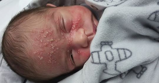 As bolinhas no rosto do bebê foram aparecendo rapidamente. Ao levá-lo ao hospital, ele recebeu o diagnóstico de herpes.