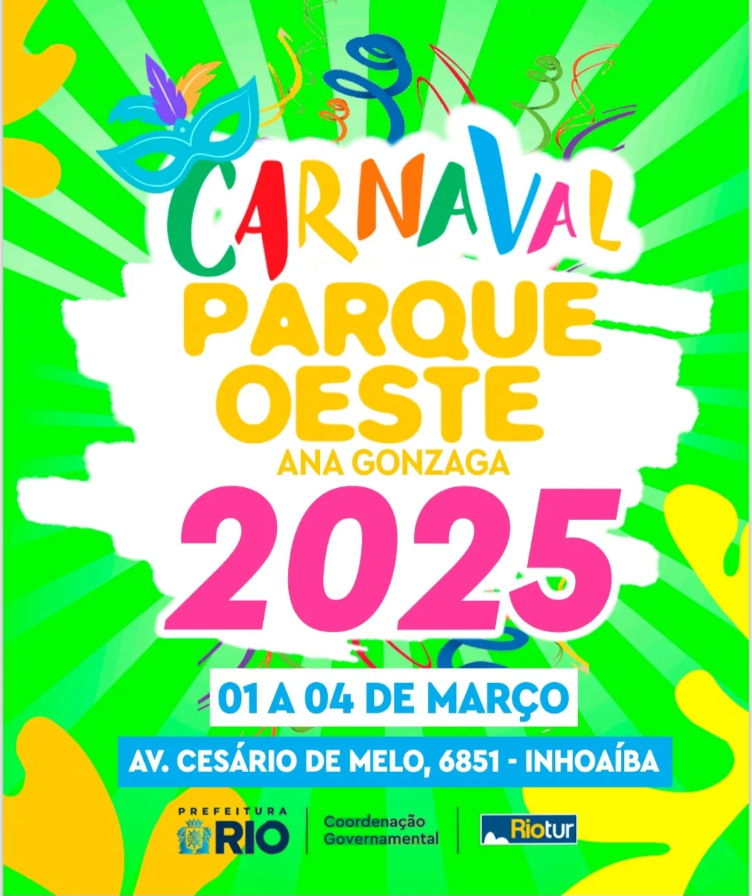 O evento acontecerá na Avenida Cesário de Melo, 6851, em Inhoaíba, das 15h às 21h. Será um ponto de encontro para foliões de todas as idades, trazendo uma programação especial com blocos carnavalescos, bandas ao vivo, DJ’s e apresentações culturais.
