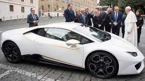 O Papa Francisco foi presenteado nesta quarta-feira (15) com um carro da marca de luxo Lamborghini, de cor branca e com detalhes em amarelo (cores da bandeira do Vaticano), que será leiloado para financiar quatro projetos humanitários, informou a Santa Sé.