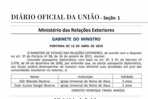A informação consta no Diário Oficial e foi concedida pelo ministro das Relações Exteriores, Ernesto Araújo. O documento informa que Edir Macedo Bezerra, e sua esposa , Ester Eunice Rangel Bezerra terão o passaporte por 3 anos.