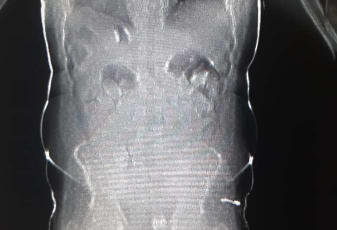 Imagem de raixo-x divulgada pela corporaçăo mostram as cápsulas dentro do corpo de um dos acusados. Eles responderăo por tráfico de drogas, crime com pena que varia de 5 a 15 anos de reclusăo.