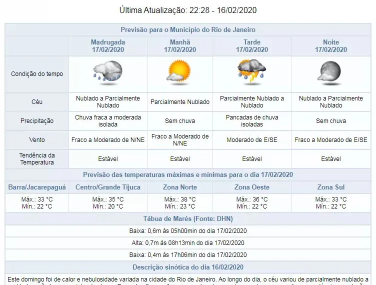 O tempo na capital fluminense permanecerá instável, nesta segunda-feira, devido à atuação de áreas de instabilidade em altos níveis da atmosfera, associadas à disponibilidade de umidade. Segundo o Alerta Rio, para o final de noite de domingo (16/02) e início da madrugada de segunda-feira (17/02), ainda há condição para a formação de núcleos de chuva moderada sobre a cidade e em seu entorno, podendo a mesma ser forte em curtos períodos de tempo.