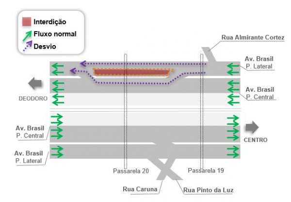 Os veículos serão desviados para a pista Central da Avenida Brasil.