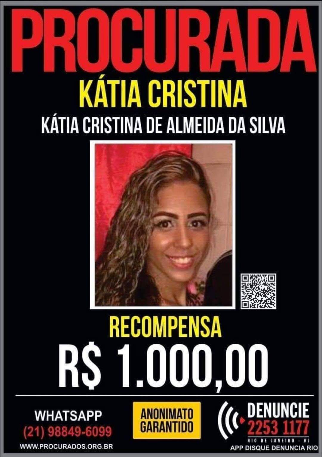 Quem tiver qualquer informação a respeito da localização de Kátia Cristina, favor denunciar pelos seguintes canais: Whatsapp do Portal dos Procurados (21) 98849-6099; pelo facebook/(inbox), endereço: https://www.facebook.com/procuradosrj/, pelo mesa de atendimento do Disque-Denúncia (21) 0300 253-1177, ou pelo Aplicativo para celular do Disque Denuncia.