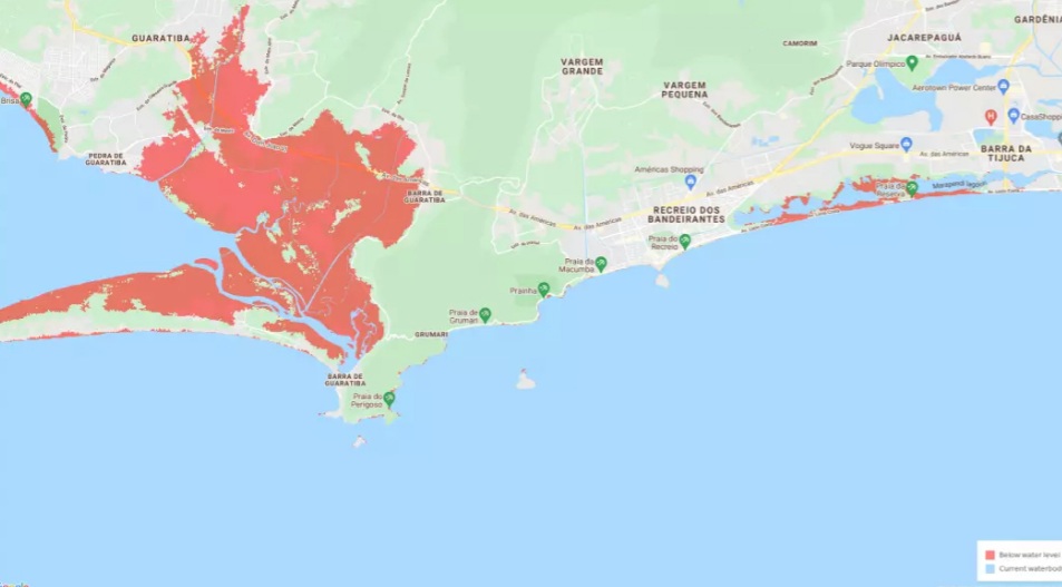 Veja o mapa que mostra Sepetiba até Guaratiba em 2030, o vermelho é a parte que pode ficar submersa: