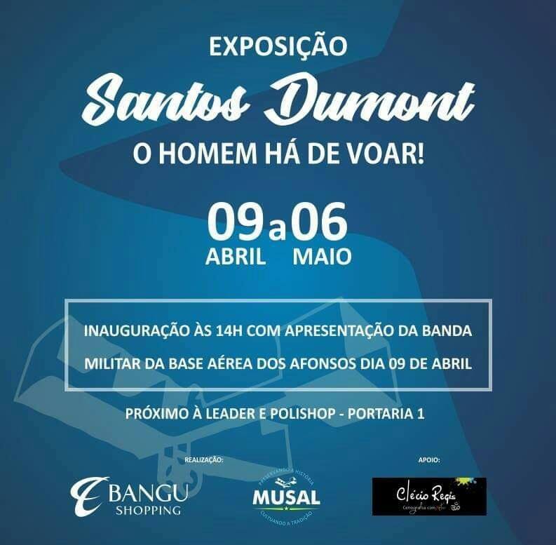 De 9 de abril a 6 de maio, o Bangu Shopping em parceria com o MUSAL e apoio do cenógrafo Clécio Régis, receberá uma exposição gratuita sobre Santos Dumont, o Pai da Aviação. Além de uma das figuras mais importantes da história da humanidade, o brasileiro visionário terá sua trajetória exposta em uma mostra que contará fatos que marcaram a origem da aviação, principalmente, sobre as aeronaves inventadas por ele.