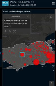 Segundo o mapa, há confirmado 88 casos de covid-19 em Campo Grande na zona oeste do Rio de Janeiro e 11 óbitos