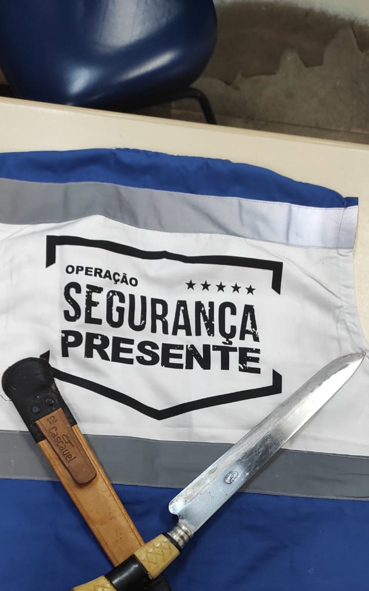 Agentes do programa Segurança Presente foram acionados para a ocorrência e informados sobre as duas vítimas no bar. Ao chegarem ao local, eles encontraram o suspeito e o perseguiram enquanto ele tentava se livrar da faca. Os policiais conseguiram recuperar a arma e detiveram o homem.