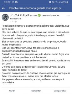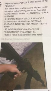 Informações ainda não confirmadas, dão conta de que a Escola Jair Tavares de Oliveira, em Campo Grande, Zona Oeste do Rio, teria suspendido as aulas nesta quinta-feira, 25 de abril, se estendendo à sexta-feira, por conta de uma suposta ameaça de massacre. Uma página, no mínimo, sinistra conta com algumas publicações do suposto autor das ameaças.
