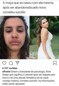 O motivo , a jovem iria se casar nesse sábado (13) porém, o noivo mandou um Whatsapp dizendo que nao iria se casar , mesmo assim a moça casou sozinha !! isso mesmo, subiu ao altar sem a presença do noivo.