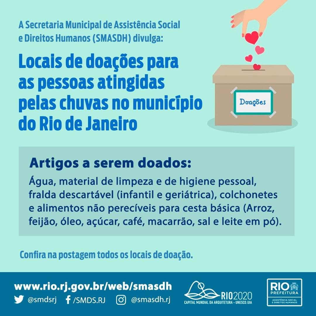 A Secretaria Municipal de Assistência Social e Direitos Humanos (SMASDH) divulga os locais para doação de alimentos e insumos para as pessoas atingidas pelas chuvas no município do Rio. Doe: Água, material de limpeza, higiene pessoal, fralda descartável (infantil e geriátrica), colchonetes e alimentos não perecíveis. (Arroz, feijão, óleo, açúcar, café, macarrão, sal, leite em pó)