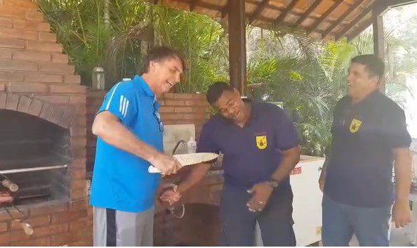 “Olha o tamanho da faca do cara. Se eu botar essa aqui em você, vai ser presidente da ONU, porra”, brinca o futuro mandatário do país. Já os homens que preparam o churrasco respondem o seguinte para Bolsonaro: “Esconde, esconde [a faca]”.